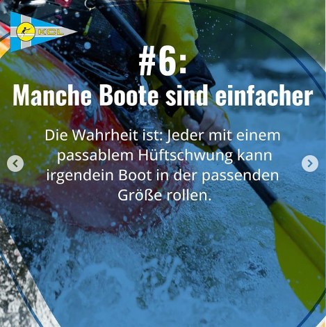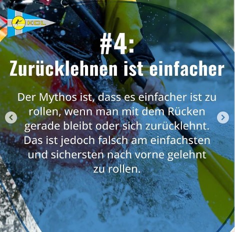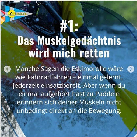 | | Rollen mit dem Kajak 1. Wenig am Körper tragen - beim Üben der Rolle (mit Schwimmweste schwieriger) 2. Beweglichkeit ist von Vorteil 3. Nicht beide Beine im Boot verkanten - nur Eines (Drehmoment aufs Boot ausüben) 4. Rechtes Bein anwinkeln - gleichzeitig Oberkörper nach Links neigen (das Becken neigt sich nach links dabei) 5. Der Körper sollte dicht am Boot bleiben, da der Wasserwiderstand niedriger ist. 6. Paddel nicht verkrampft festhalten, besser (gerade bei Grönlandpaddeln) locker halten, damit sich das Paddelblatt von selbst ausrichten kann. 7. Das Gesicht kommt als letztes aus dem Wasser - geht nur, wenn nach Unten geschaut wird (Nochmal blubbern, bevor es aus dem Wasser kommt. 8. Handrücken zeigt immer nach oben. Arten von Rollen: A. Nach Vorne den Oberkörper (Sturmrolle) Sweep Roll: Hinten rein - Vorne raus Paddel am Ende anfassen Hochhalten parallel zum Boot So bleiben bis Boot gedreht Mit Paddel an Boot klopfen "Klonk" Hohlkreuz - Kopf in Nacken Kopf nah am Boot halten Druck auf Paddel ausüben Boot kippt durch Hüftschwung Bauchmuskeln anspannen Oberkörper beugen Rechte Hand drückt - nicht ziehen Das Paddel wird parallel zum linken Oberschenkel geführt Paddelhaltung: Rechte Hand: Handrücken an die Stirn | Linker Arm gestreckt Das Paddel führt die Bewegung des Oberkörpers nach Rechte Hand bleibt in der Nähe des Kopfes Ellenbogen am Körper lassen