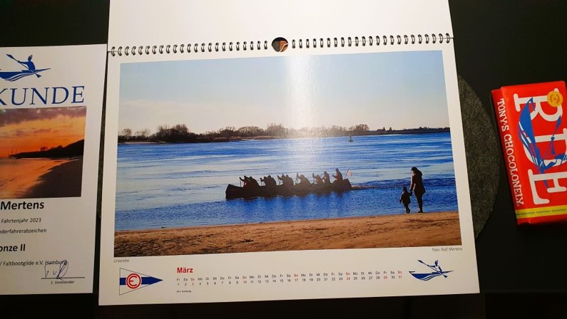 · Der Verein "Ring der Einzelpaddler" erstellt jedes einen Jahreskalender mit den eingesendeten Fotos der Mitglieder. Und tatsächlich - ich hatte nicht damit gerechnet - ist mein Foto auf dem März Kalenderblatt zu sehen - ich habe mich riesig gefreut. Das Bild zeigt den Zehner "Lühesand" Anfang Januar 2018 auf der Unterelbe bei Blankenese. Selten gelingen Gegenlichtaufnahmen auf Anhieb - hier war es so. Die Paddler sind gerade noch so zu erkennen, da sie in ihrem eigenen Schatten sich befinden. Eine Bewegung ist zu erahnen, da die Mutter mit ihrem Kind auf dem Strand davor, die Füße heben.