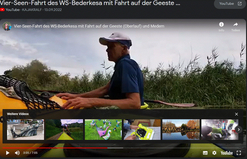 · Ach ja, beinahe vergessen. Der Wassersportverein Bederkesa hat mein Video von der VierSeenFahrt2022 auf seiner Homepage verlinkt. Wer noch nicht die Medem, den Flögelner See, Halemer See, Dahlemer See und den Hadelner Kanal befahren hat, kann dies in 2024 wieder tun - siehe DKV-Sportprogramm. Ulrike freut sich bestimmt Euch kennenzulernen 🙂