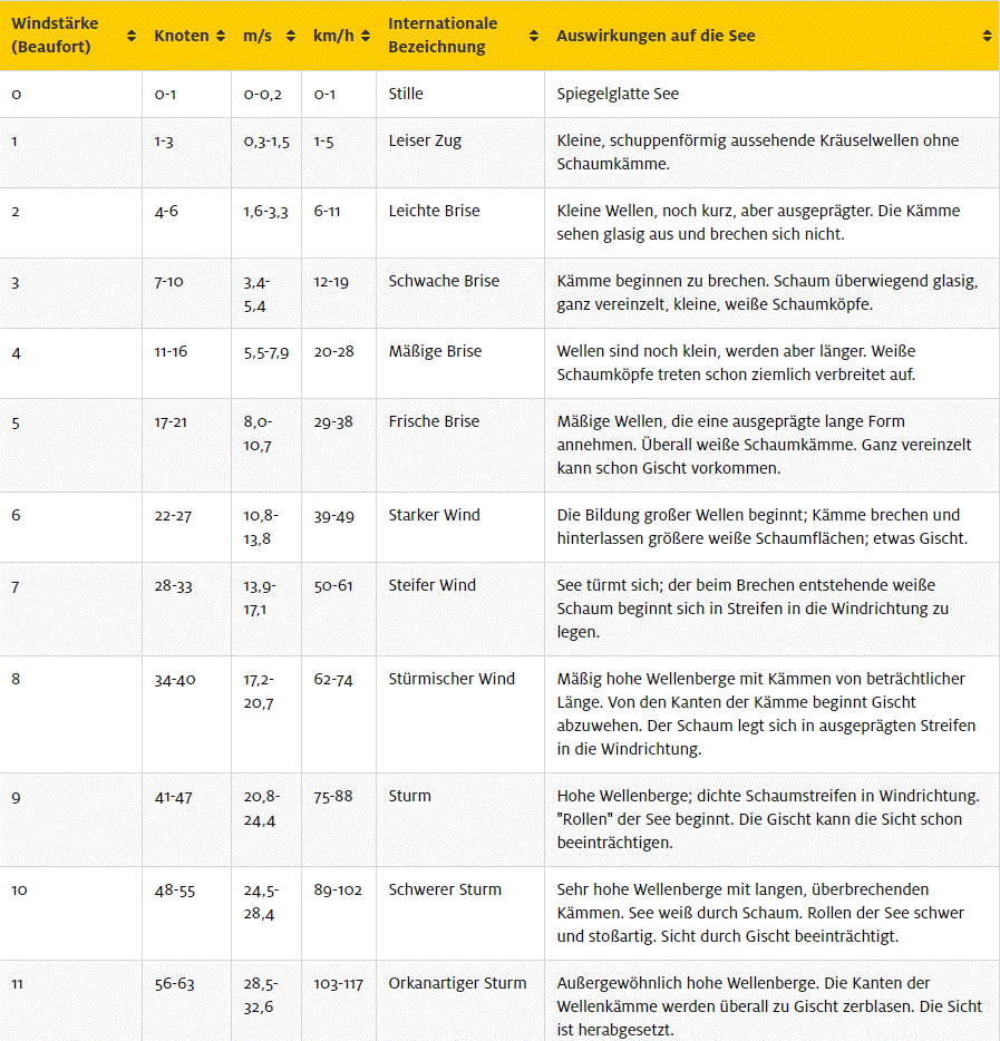 Handlog – Messung der Fahrt mit Logleine ( mit Knoten markiert ) + Logscheid ( „Holzbrett“) - das Logscheid bleibt im Wasser senkrecht stehen und spult die Logleine ab - an dem Knoten der Logleine kann die Geschwindigkeit abgelesen werden - Zeit = Verhältnis durchlaufende Knoten - die Messung der Zeit erfolgte früher mit einer Sanduhr ( Logglas ) In der Seefahrt bezeichnet ein Kabel (engl. cable) den zehnten Teil einer Seemeile und beträgt 185,2 Meter. Allgemein, z. B. in Seefahrt Erzählungen nennt man diese Einheit auch Kabellänge (engl. cable length). Als Grundsee werden Wasserwellen bei starkem Seegang bezeichnet, die in den relativ seichten Küstengewässern höher und damit steiler werden, ehe sie brechen. Ursache dafür ist, dass sich Wellen im flacheren Wasser langsamer als im tiefen Wasser ausbreiten. Im Vergleich zum tiefen Wasser können sie dort doppelt so hoch werden. Grundseen entstehen, wo die Wassertiefe geringer ist als die halbe Wellenlänge beziehungsweise etwa fünffache Wellenhöhe an der Gewässeroberfläche. Den Namen haben Grundseen erhalten, weil sie den Meeresgrund aufwühlen und daher das Wasser dort größere Mengen an Schwebfracht, vor allem auch relativ grobe Partikel (Sand), mit sich führt.