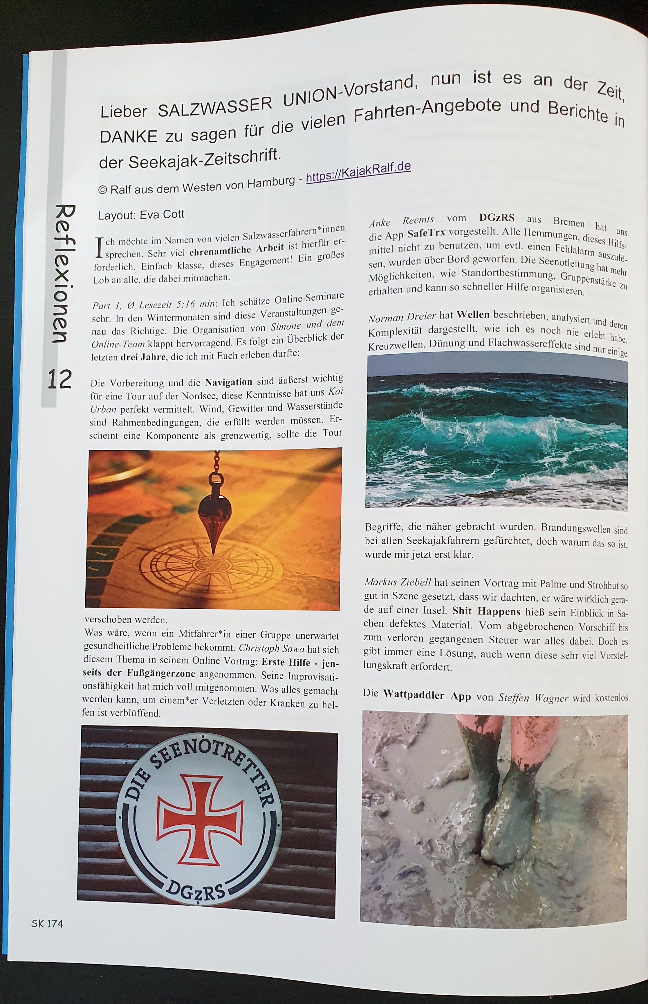 Ich schreibe Blogs, davon sind einige auf der DKV-Seite (Deutscher Kanu-Verband), Seekajak-Zeitschrift der Salzwasser Union und