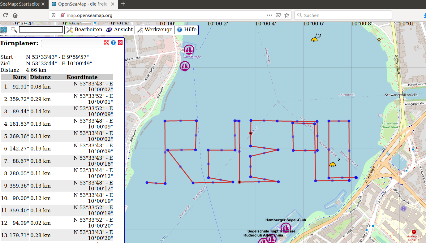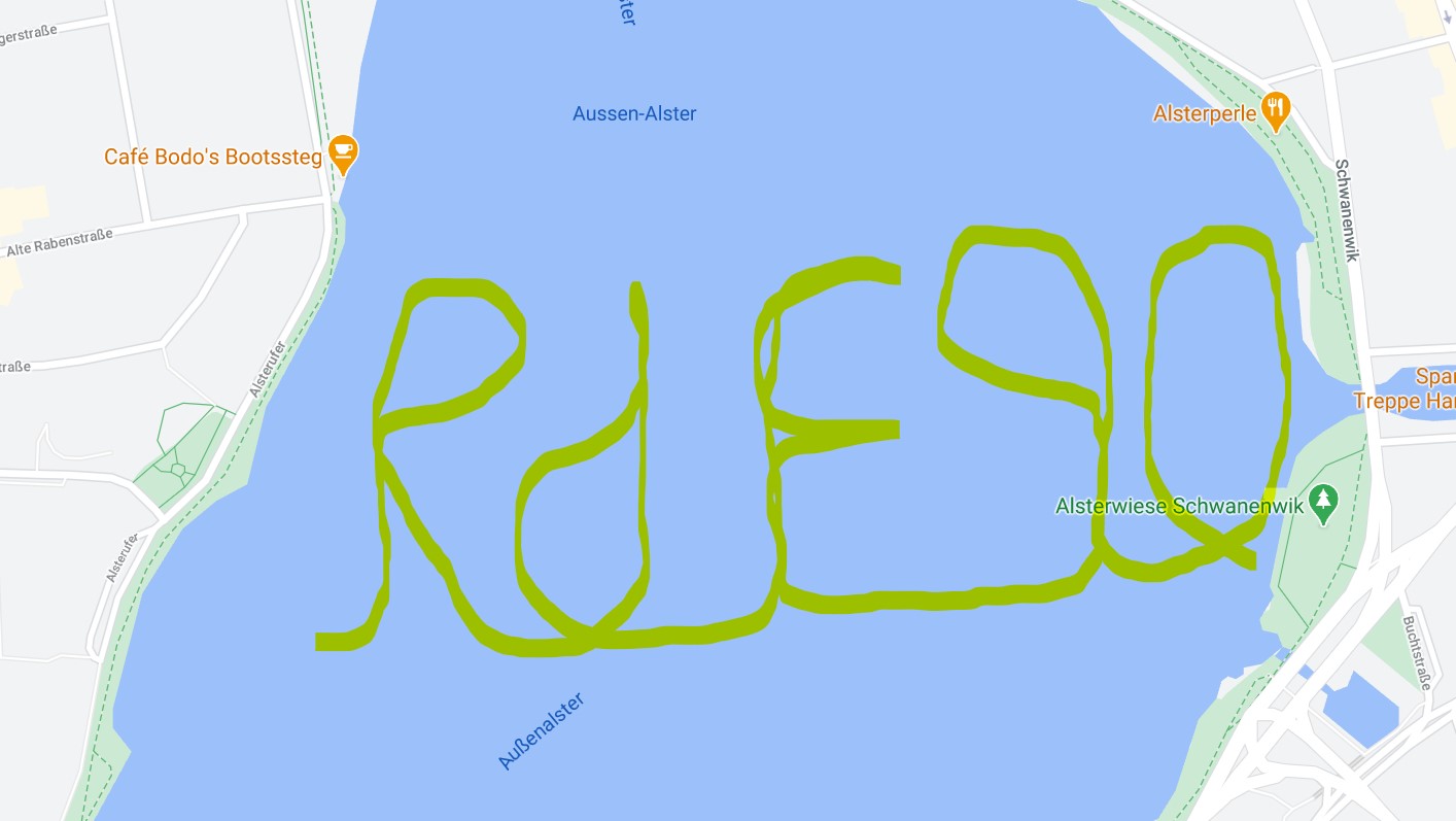 Canua-App Aufzeichnung starten 1. Beginnend mit dem R querab "Hotel Fontenay" Richtung Norden bis etwas hinter Anleger "Rabenstraße". Höhe "Alsterperle" Ostufer (nicht weiter nach Norden fahren) den 270°Bogen fahren. SüdSüdOst Richtung Süden bis Höhe Hotel. 2. - kleines d - 90°Bogen nach Norden - Kehrtwende bis Hälfte der Strecke - nach Westen genau auf Anleger Rabenstraße zu. nach Süden Bogen 180°fahren bis Höhe Skuptur "Drei Männer im Boot" Ostufer. 3.großes E - 90°nach Norden bis Höhe Alsterperle querab Ostufer - Kehrtwende nach ein paar Paddelschlägen (zählen). 90° Süden (nur wenige Paddelschläge) - 90° Osten - Kehrtwende - Süden - 90° Osten 4. 90 Richtung Norden bis Alsterperle - 270°Bogen - Süden - Osten (Skulptur) - Norden 180° Bogen - Süden - Osten - Fertig Aufzeichnung stoppen + speichern! Wahrscheinlich sieht der Track so ähnlich aus, wie die Freihand Malerei oder vielleicht sogar besser :-)