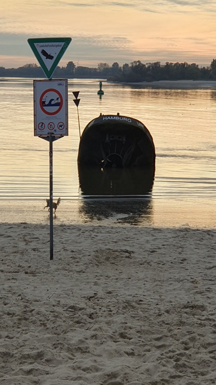Beteiligte Schiffe: Uwe - 60m lang, 6,4m breit - Stapellauf 1914 ie Uwe wurde vom Bergungsunternehmen Harmstorf geborgen und verschrottet. Das Heck erwies sich als zu schwer und wurde zur weiteren Verwertung auf den Strand des Betriebsgeländes gezogen, wo es dann verblieb, nachdem die Stadt Hamburg das Gelände gekauft hatte. Die Position des Wracks ist: ♁53° 33′ 33″ N, 9° 47′ 18″ O