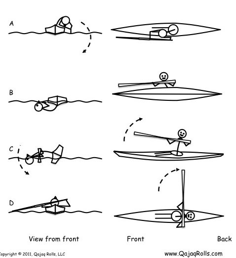 d) Stemme das Paddel während dieser Rolle nicht nach unten, der Bogenschlag des Paddels über die Oberfläche wird einen gewaltigen Auftrieb bringen, welches eine Aufrichtung des Kajaks erlaubt und der Rücken auf des hintere Deck rutscht.